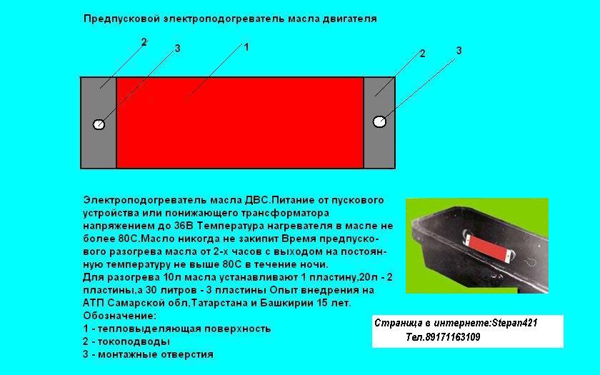 Одна пластина рассчитана на подогрев масла объемом 10 литров на 80С.На каждые последующие 10 литров устанавливают еще по 1 пластине на одно и то же вводное устройство с расстоянием 8-10 мм между пластинами.Время подогрева масла от 2-х часов с выходом на установившуюся температуру до +60С.Температура поверхности нагревательной пластины в масле до +80С и максимальная температура масла двигателя КАМАЗ,МАЗ в режиме ночного подогрева составляет +80С. Масло не портится, нагарообразования нет.Стационарная линия подогрева масла от одного понижающего 3-х фазного трансформатора на 24В или 36В рассчитана на одновременный разогрев масла двигателя 35-40 автомобилей типа КАМАЗ на стационарной линии. Справки по тел 89171163109 или видиоконсультация по скайпу: логин Stepanov505
